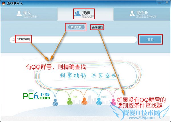 2.打开查找联系人面板后再点找群,如果你已有qq群号码则直接精确查找,反之则条件查找,本教程以pc6软件群136090816为大家示范。