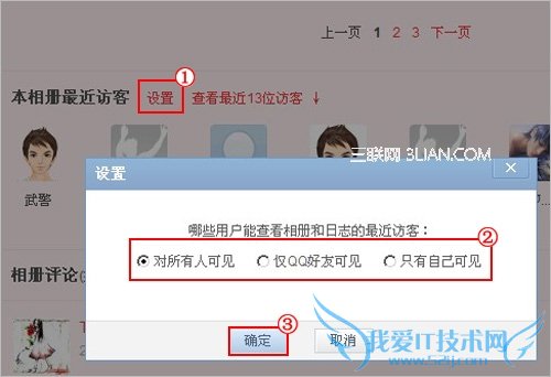 2、本相册最近访客旁边点击“设置”,有三种权限供您选择:对所有人可见、仅QQ好友可见、只有自己可见。