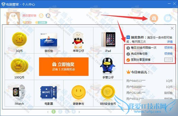 QQ电脑管家客户端 领礼包 每天抽奖活动。奖品有Q币、QQ公仔、iPad等实物奖励。每天完成电脑管家简单任务可以抽奖3次,至于运气就靠人品了。没有啥特别的要求。下面小编就为大家介绍活动详情以及参与活动步骤,大家一起来看看吧!