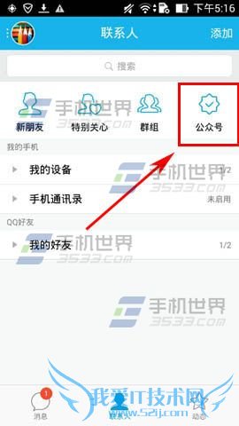 1)打开手机QQ,进入联系人界面点击【公众号】;(如下图)