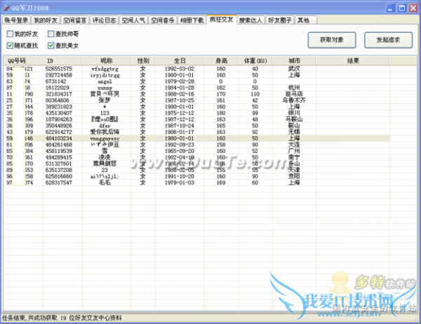 疯狂交友可群发交往请求,让你被更多人关注,也许你的缘分就在其中。页面共有四个选项“我的好友”、“随机查找”、“查找帅哥”、查找美女”,用户可以根据需要选择,然后点击“获取对象”按钮,程序将帮您找出符合要求的QQ号码并显示出来。