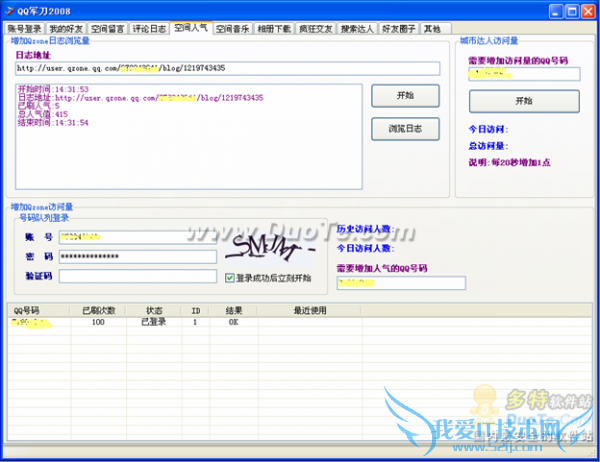 空间人气页面共包括了3大功能。一是通过输入日志的链接地址可以增加日志的浏览人气;二是通过输入QQ号码可以增加其城市达人的访问量;通过输入QQ号码及相应密码可以增加此QQ号码的空间访问量。但要注意的是城市达人的访问量每20秒才能增加1点;并且每个QQ号每天只能给别人增加100点人气,超过100点后是不会增加的。