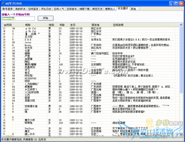 进入好友圈子页面,用户可以随便输入一个QQ号码,点击开始按钮,程序将自动查找此QQ号的空间好友,然后搜索好友的好友形成一个好友链。