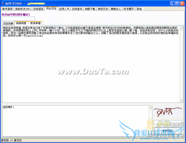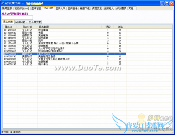 此功能和空间留言可以说有异曲同工之妙。但它有个特别的地方就是您事先不需要进行QQ的登陆,可以直接在评论日志页面输入任意的QQ号码回车,此时程序将会显示此QQ号下所有公开的日志列表,如果有的话。通过右键菜单“阅读回复”您还可以阅读选中的日志,并且给日志发表评论,方法同上。