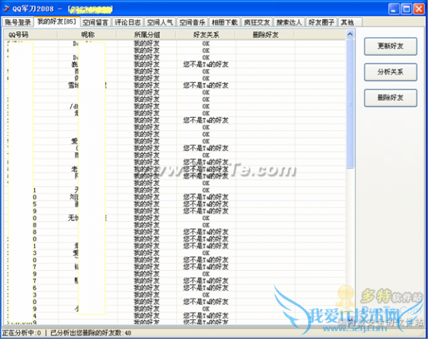 使用好友分析功能的前提是首先必须成功登陆一个QQ号,然后才能分析这个QQ号码中的哪些好友把您从他的QQ中给删除了。有一点要注意的是,在登陆页面登陆QQ时,如果选中了“自动获取好友列表”选项,那么成功登陆后在我的好友页面将会自动显示此QQ的全部好友列表;如果登陆时没有选择此项,那么在我的好友页面将不会自动显示,但用户可以点击“更新好友”按钮来显示;然后再点击“分析关系”按钮,就可以看到到底有哪些QQ好友把你从他的QQ中删除了。