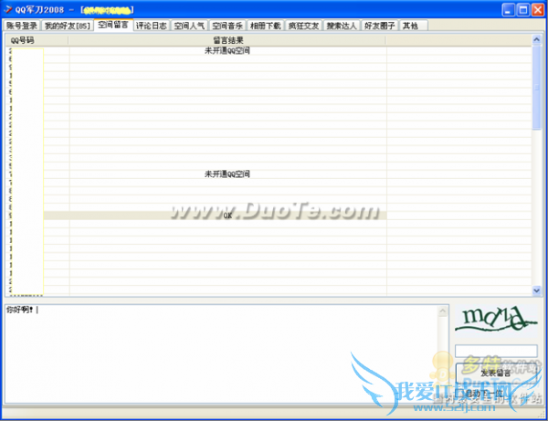 空间留言功能,让您无需进入缓慢的QQ空间即可给好友留言,但它的前提是要先登陆一个QQ号。然后在我的好友页面通过右键菜单选择“空间留言”,此时程序会自动将好友QQ号加入到空间留言页面。然后您只要选中要留言的QQ号,在下方输入您的留言,再根据提示输入验证码即可。如果选中“自动下一位”选项,那么当您给一个QQ空间留言后,将自动跳到下一个QQ号,不用你再去选择。
