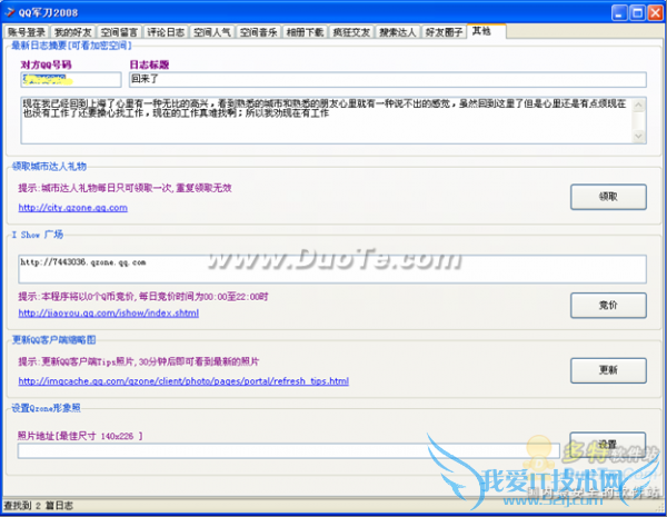 进入其它页面,用户可以查看某个QQ号码下的最新日志、可以领取礼物、可以进行竞价、可以更新客户端缩略图、可以设置空间形象等。