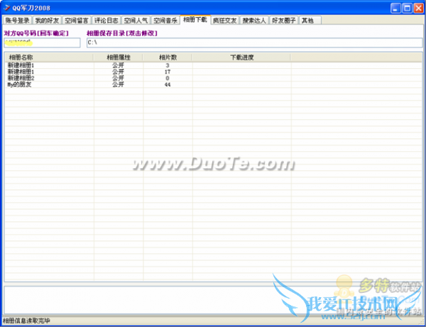 相册下载可以说是个非常出色的功能,用户不用再一张张的手动另存为,通过本软件一下搞定。只要输入一个QQ号码,然后回车即可将此QQ号码下所有的公开相册列出来,用户只要进行双击列表即可进行下载,并且相册的保存路径用户也可自行设置,默认为C盘根目录。