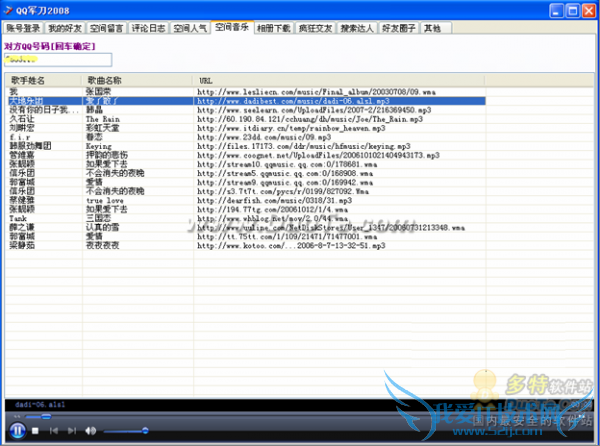 空间音乐使您能轻而易举的获取他人空间音乐地址。进入空间音乐页面后,用户可以直接输入一个QQ号码来查询此QQ号是否添加及收藏了QQ音乐,如果有的话,程序将自动显示音乐列表,而用户也可通过双击选中的歌曲,来进行试听。