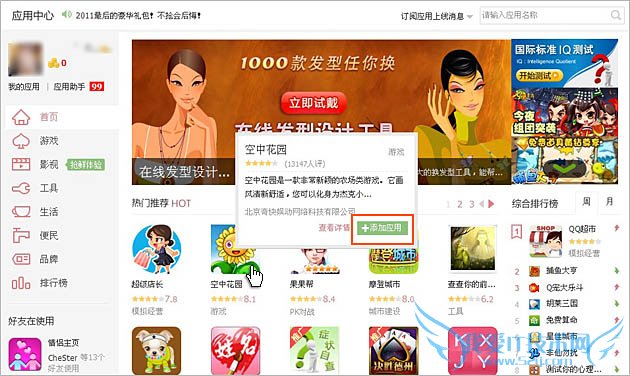 将鼠标放在要添加的应用游戏‘空中花园’上,会弹出对话框,根据页面提示点击‘添加应用’即可。