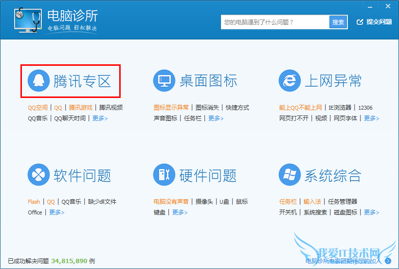 通过大分类找到并解决问题,例如遇到QQ音乐、QQ登陆问题,可以从”腾讯专区”分类进入找到这些问题: