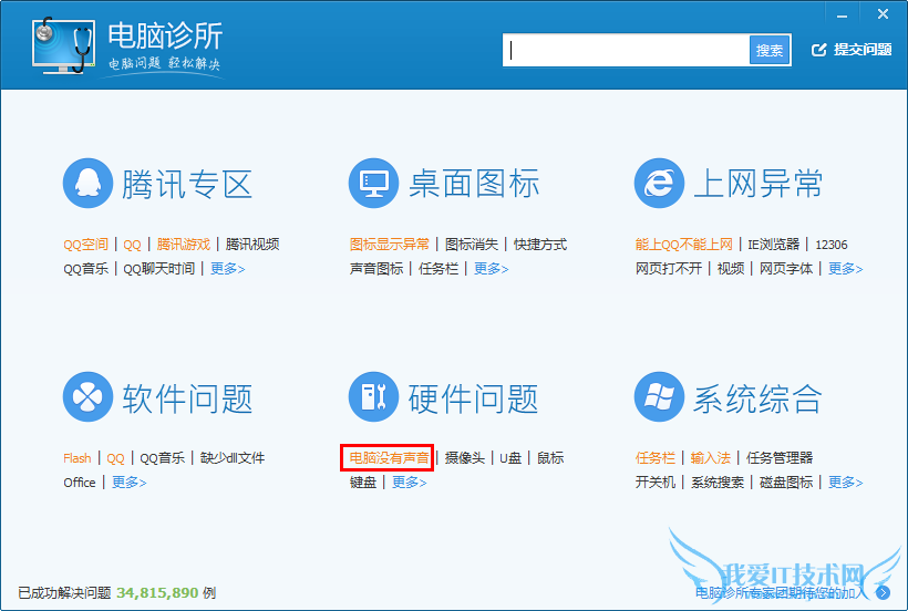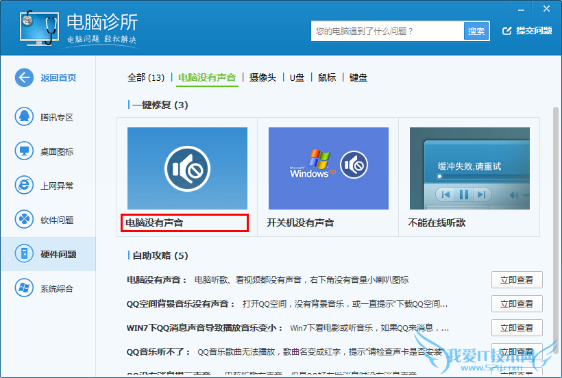 通过点击首页标签,进入相关问题分类,例如“没有声音”可在“硬件问题-电脑没有声音”标签进入: