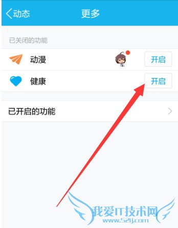 打开手机QQ客户端,登陆成功进入消息界面,点击下方【动态】进入动态界面,首次需要开启健康功能,点击右上角【更多】