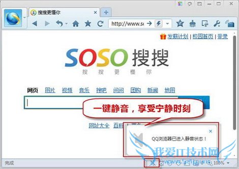 弹出框或者网页广告不厌其烦的声音骚扰让人深恶痛绝,使得用户享受宁静的线上生活成了一件奢侈的事。QQ浏览器6.7正式版网页静音功能,用户可以单击状态栏下的小喇叭,就可以自主控制网页的声音,想听就听,想关就关。轻轻一点,“整个世界清静了”。