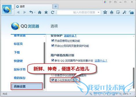 很多用户喜欢把程序最小化到任务栏上,希望能随时调用,却发现任务栏越来越挤,有时找个东西都很困难。QQ浏览器缩小到托盘功能,在“常用菜单-选项” “高级设置-托盘”中勾选“最小化到系统托盘区”可以为任务栏腾出一片天地,清晰的托盘图标,新鲜、神奇,更能方便准确的打开QQ浏览器,快速浏览,真是一举两得、贴心的应用。