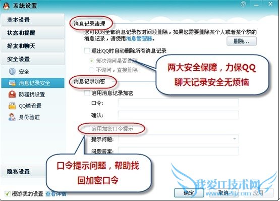 聊天记录涉及个人隐私,有时更属于工作机密,什么方法才能有效保障它们的安全呢?QQ现在提供了双保险。进入“系统设置-消息记录安全”功能, 我们可以自定义启用“消息记录清理”及“消息记录加密”功能,勾选相应功能,即可实现退出QQ时删除聊天记录或QQ聊天记录的口令加密,QQ聊天记录安全 自然“万无一失”。(图3)