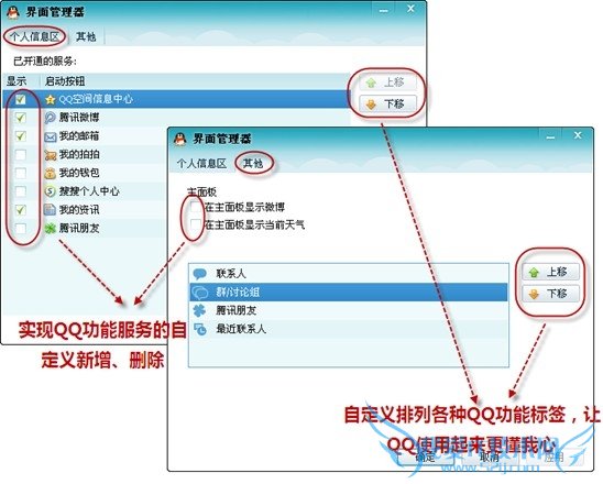 每个人都有自己的爱好和习惯,使用QQ也不例外。现在,通过QQ界面管理器就能实现QQ面板快捷功能按钮的有效搭配了。在QQ主面板上单击右 键,即可启动界面管理器,通过“已开通服务”及“其他”选项,能自由对QQ主面板中的快捷服务入口、QQ标签进行自定义新增、取消、位置排列等操作,合理 布置安排QQ功能服务,使用起来自然更懂我心。(图5)