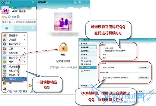 与此同时,通过QQ锁,我们可以根据自身需要对QQ进行自定义安全锁定,保障聊天隐私的安全。而值得注意的是,在对QQ进行加锁的同时,QQ也 同时保持在线,这样就不怕客户、好友们找不到我们了。操作上,只需点击“锁定QQ”即可马上锁定QQ,解锁时可通过QQ密码或独立密码进行解锁,方便同时 更兼具人性化。(图4)