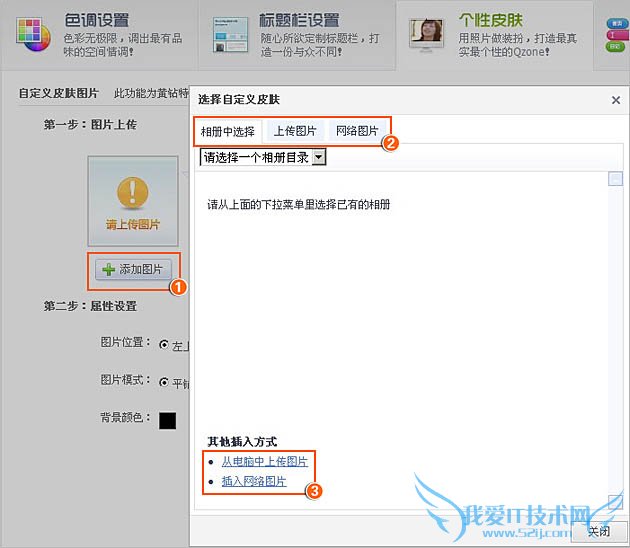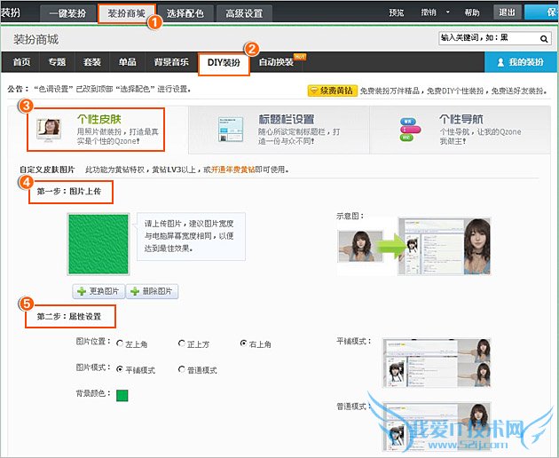 登录QQ空间,点击“装扮”---->装扮商城---->“DIY装扮”---->“装扮设置”---->个性皮肤--->“图片上传”---->“属性设置”;按照提示进行操作即可;