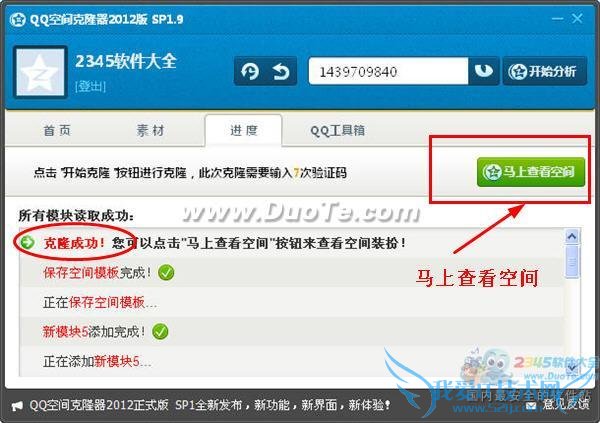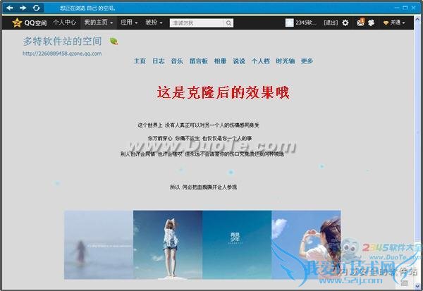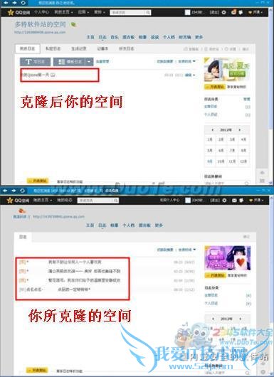 第五、到这里一个空间就克隆好了,点击“马上查看空间”你就可以查看你新克隆的空间啦,让我们一起看看克隆后你的空间与你所克隆空间的对比图吧。经过对你会发现,你并没有把他人空间的内容一起克隆过来哦,所以用QQ空间克隆器还是很安全的,不用担心自己的空间信息被修改!
