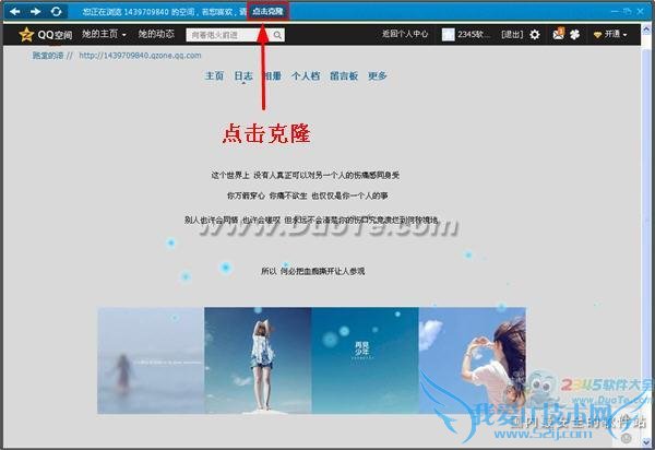 第四、下面是小编非常喜欢的一个QQ空间,就是对方的QQ空间。现在就以它为例看看怎样进行克隆吧:首先,点击页面上方的“点击克隆”按钮。然后软件就会自动的进行QQ空间的克隆了。克隆完了以后点击“开始克隆”,开始克隆后童鞋们就要有耐心啦,因为要输入七次验证码啊!