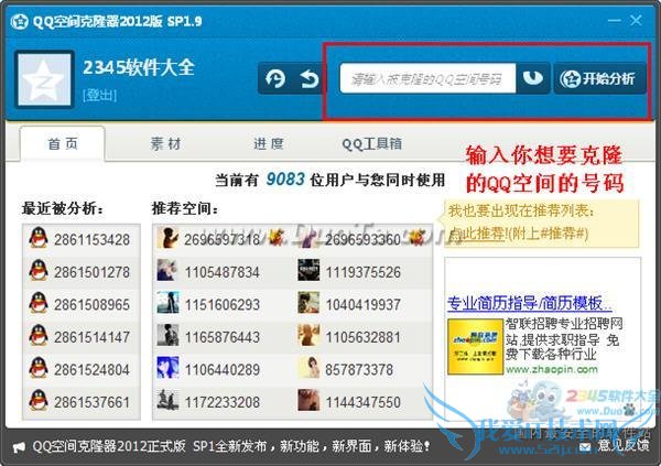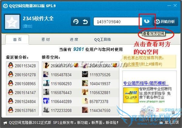 第三部、寻找心仪的QQ空间,摩拳擦掌准备克隆,在软件的右上方输入你想要克隆的QQ空间的号码,然后点击就可以查看对方的QQ空间啦。