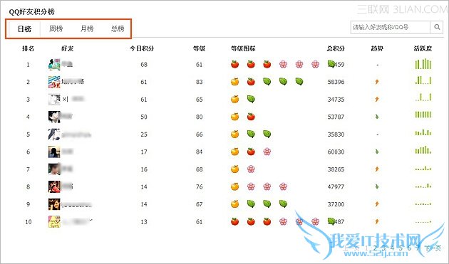 说明:日、周、月榜排序按积分从高到低的顺序排列。在积分相同的情况下,则总积分高的用户排名靠前;如总积分也相同,则排名保持一致。例如:两位好友日获取积分均为20,好友A总积分>好友B总积分,则好友A排名靠前。如好友A总积分=好友B总积分,则A、B排名一致。