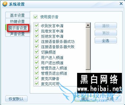 根据自己的需要,也可选择使用声音提示。如果选择声音提示,可以设置各种事件发生时提示音所播放的声音文件,并可以用自己喜欢的音乐更改所选择的提示音,