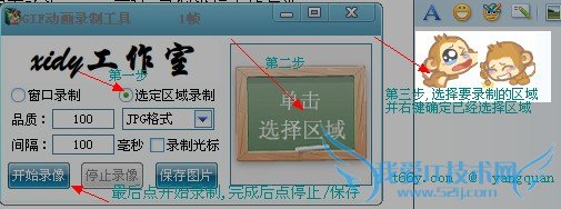 2,打开后,看见的界面很友好,很简洁,首先,可以选择"窗口录制"或者"选定区域录制",点选的时候,右边的小屏幕会有教程让你如何操作.