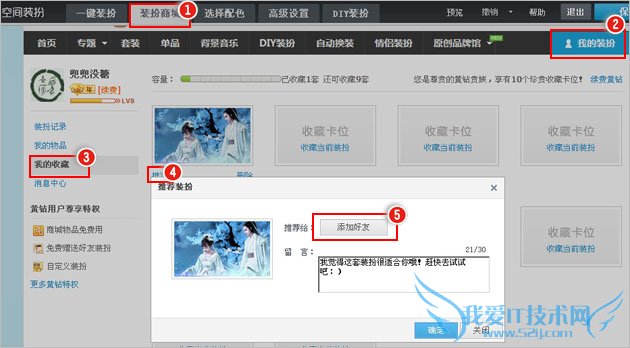 2、点击“装扮商城”后点击右侧“我的装扮”,再点击左侧侧边栏中“我的收藏”后,选择您要推荐的装扮,点击正文的“推荐”,在弹出的推荐装扮的框中点击“添加好友”,再将您要推荐的好友选择便可完成。
