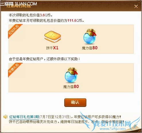 红钻用户:每日可领取1个饼干+80魔力值。(没有领养精灵,则无法获得饼干)。