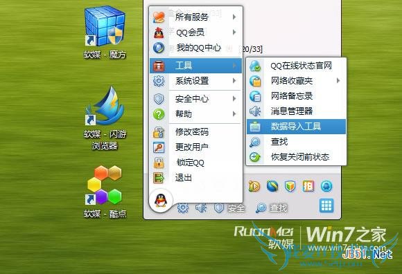 第三步,面板左下角有一个无色的企鹅标志,点击选择“工具”-“数据导入工具”-“消息记录(自定义表情可选)”-“从指定目录导入”-“浏览”-“C:Users我的文档Tencent Files(自己的QQ号码文件夹)(之前QQ保存消息的路径)”-“确定”-“导入”。