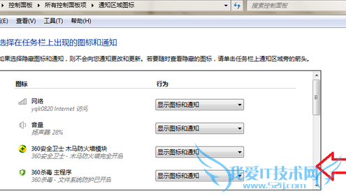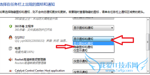 3、在qq图标后面,行为一栏里点击下拉菜单,共有“显示图标和通知”、“隐藏图标和通知”、"仅显示通知"等三种选择。这里我们选”隐藏图标和通知“。