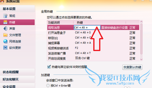 因此这种通过qq自身隐藏qq图标的方法比较彻底,但是如果想查询是否有新消息,可以打开系统设置,点击左边的热键,再点击右边的热键按钮更改快捷键按钮,或记住提取消息的原始热键即可随时打开消息。