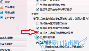 3、在系统设置界面里找到主面板下面的”在任务栏通知区域显示qq图标“,把前面的勾选框的对勾去掉,然后点击确定。