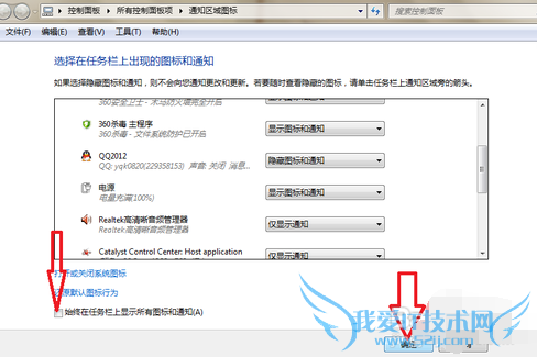 4、选择完后,还要注意左下角有个”始终在任务栏上显示所有图标和通知“,要确保前面的选框空着,不要选。然后点击确定,这样任务栏里的qq图标就隐藏了。
