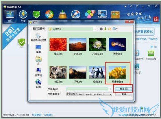 单击管家7.0版本主界面的皮肤按钮,在打开的对话框中选中“+”,即可打开自己的文件夹。选中一张自己喜欢的图片,点击打开即可看到立即更换新皮肤。