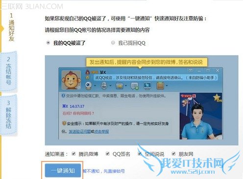 为了让朋友们都不要上当,进入“紧急冻结”界面后,点击“冻结QQ”,接着选择“通知好友”,把你QQ账号被盗的消息,通过“腾讯微博”、“QQ签名”、“空间说说”、“朋友网”的渠道,一键通知你的朋友。