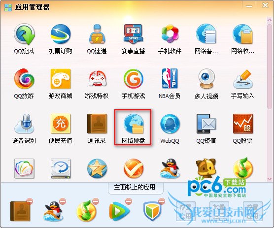 登录qq后在qq面板倒数第二排有一个9格的方框图标,也就是应用管理器,打开应用管理器就能找到网络硬盘啦。