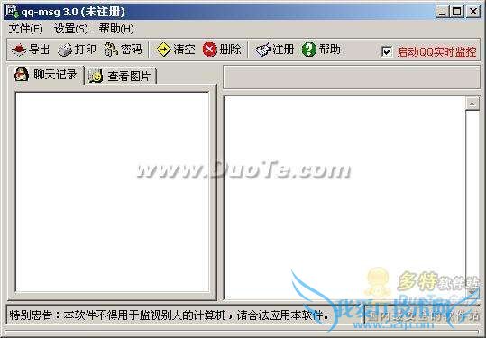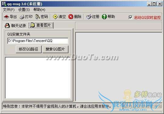 另外就是记得勾选界面右上角的“启动QQ实时监控”一项,这样即完成了整个设置过程。当去掉“启动QQ实时监控”前的打钩时,本软件即停止监视QQ聊天窗口功能。此时手工删除本软件所在文件夹,即可彻底删除本软件。