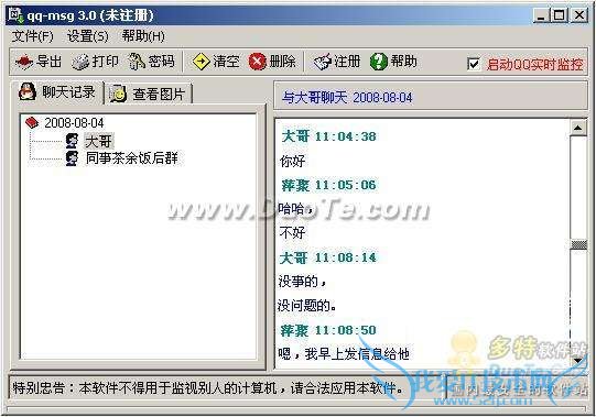 另外该软件还可将聊天记录导出保存为文本文件或将其打印存档。点击工具栏中的“导出”和“打印”按钮即可实现相关功能。