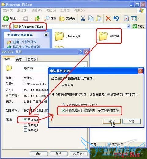 2、找到QQ安装后的文件夹后右键单击它,左键选择“属性”,在“常规”选项卡下的“属性”项中勾选上“只读”属性后点“确定”按钮,在“确认属性更改”对话框中选择“将更改应用于该文件夹、子文件夹和文件”,最后点“确定”,如图5。