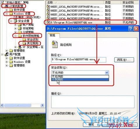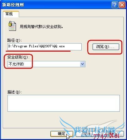 在“新路径规则”对话框中点“浏览”按钮找到QQ安装文件夹下的QQ.exe,在保证“安全级别”为“不允许的”的情况下点“确定”并关闭“组策略”,如图3。这样再次启动QQ时就会提示“由于一个软件限制策略的阻止,Windows无法打开此程序。要获取更多信息,请打开事件查看器或与系统管理员联系。”