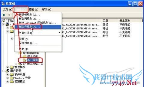 然后再双击“软件限制策略”→其它规则,再单击菜单栏“操作”→新路径规则,如图2。