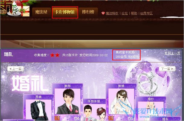 不同的套卡,集齐后的奖励各不一样,登录魔法卡片后,点击“卡片博物馆”,然后选择您喜欢的“套卡”,即可看到收集套卡成功后的奖励。如下图: