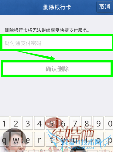5、在新打开的删除银行卡页面中,我们输入财付通密码,再点击确认删除