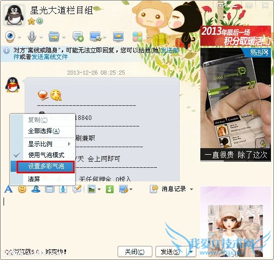2、在聊天内容界面右键单击,选择设置多彩气泡。