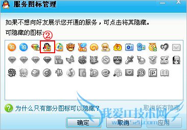 只需通过手机登录kf.3g.qq.com(或者在手机腾讯网首页底部点击“客服”)=》登录您的QQ号=》点击“手机QQ”=》“手机平台分类”下面选择其中一个平台进入=》点击“自助服务”=》点击“显示/隐藏图标”=》请设置图标状态:“隐藏”=》点击“立即设置”即可。