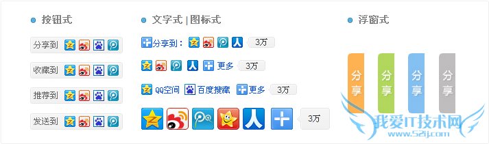 百度分享提供多种风格的分享按钮,有适合文字和图片内容的图标式按钮,有适合专题和首页的浮窗式按钮,还有文字式和按钮式两种按钮可供选择。