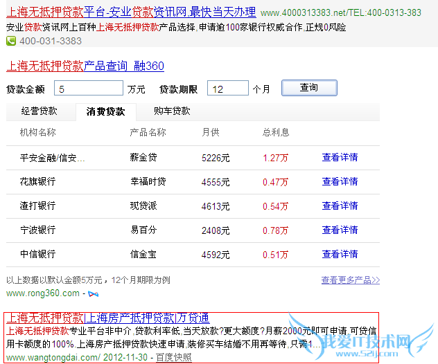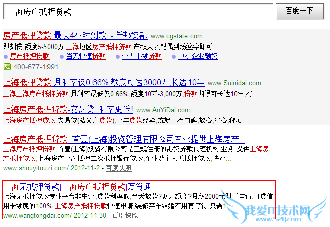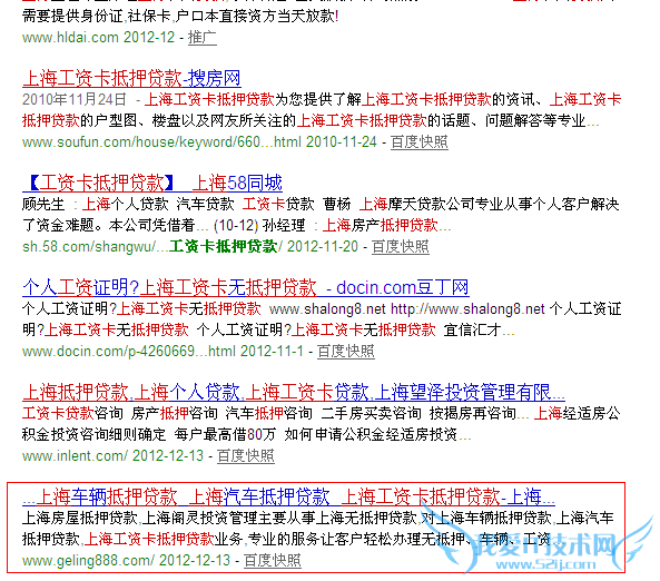 因为百度最近一直在打击贷款行业的网站,我就特意看了下贷款行业的关键词,发现了两个网站,我在百度中搜索“上海工资卡抵押贷款”如图: